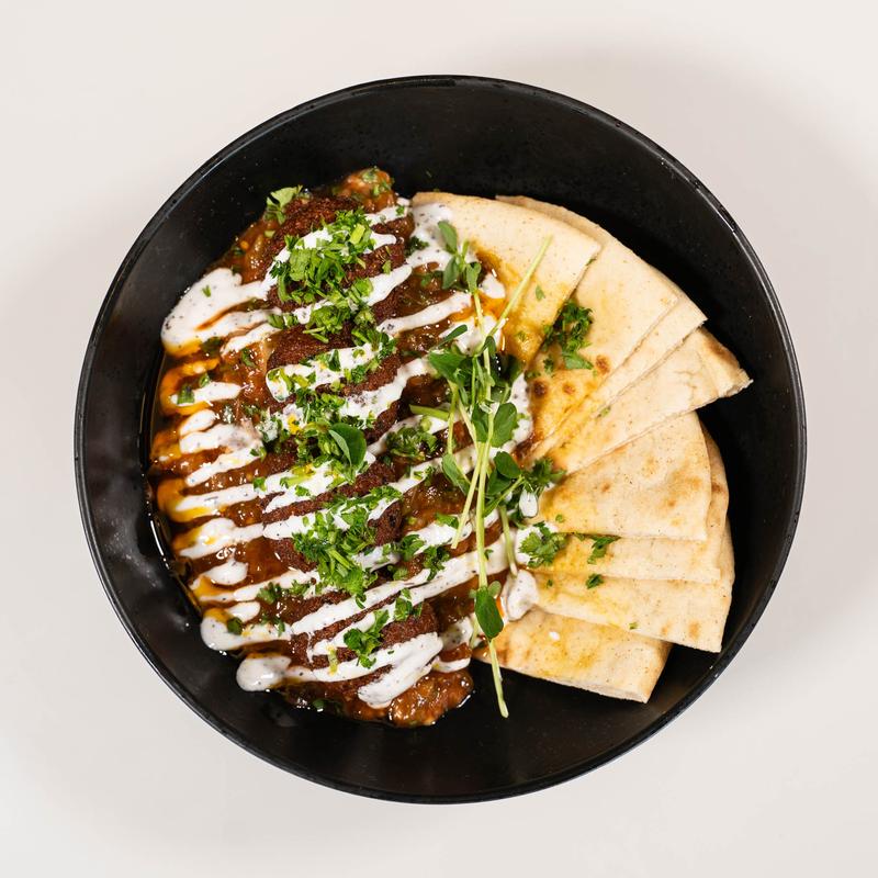 Falafel, smoked eggplant, yogurt sauce, paprika chili sauce, pita | (V Option)