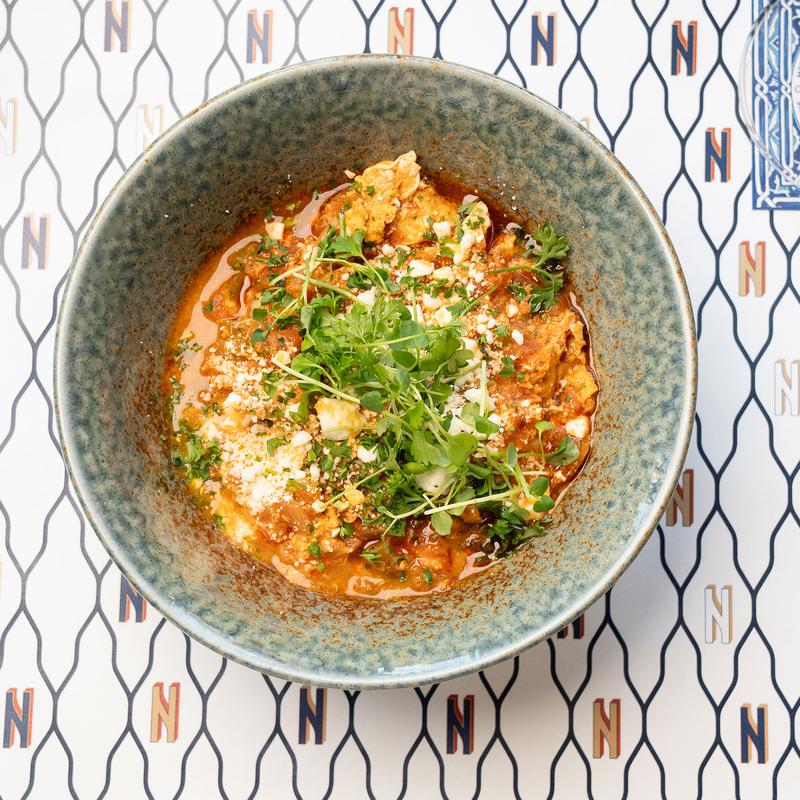 Tomato, pepper & onion braise 2 eggs, feta, parsley, paprika & chili oil, pita.