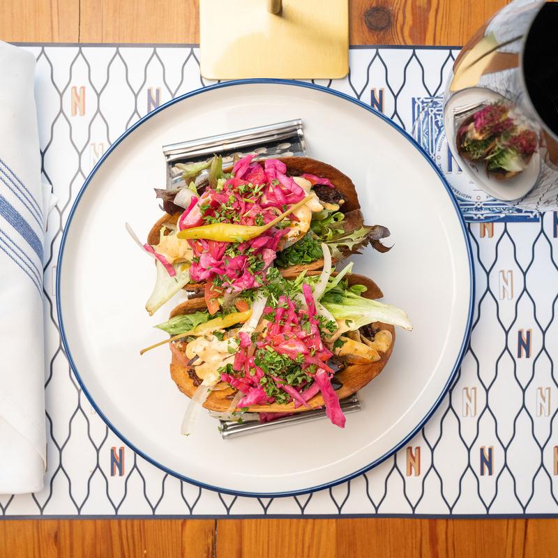 3 flour tortillas, pulled beef, mixed greens, turco de gallo, cheese, chipotle aioli, pickled red cabbage, and pickled hot peppers.